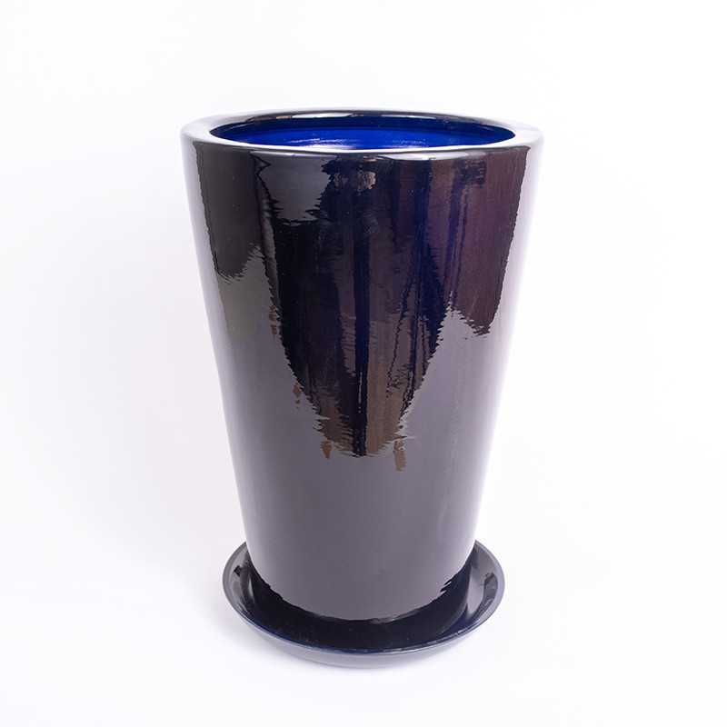 Donica ceramiczna okrągła w odcieniu granatowego połysku. Posiada otwór na spodzie oraz podstawkę w tym samym odcieniu.