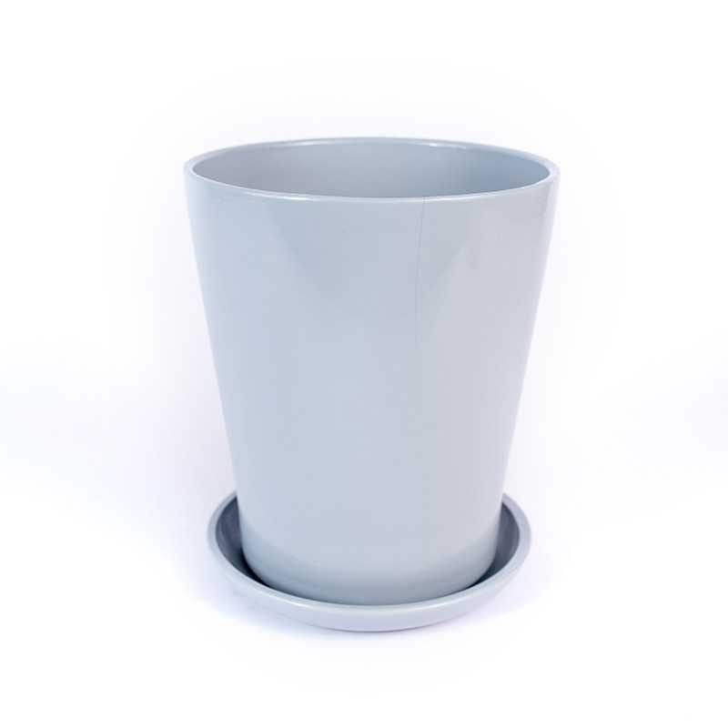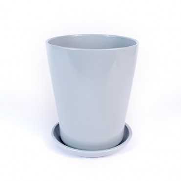 Donica ceramiczna okrągła w odcieniu szarego połysku. Posiada otwór na spodzie oraz podstawkę w tym samym odcieniu.