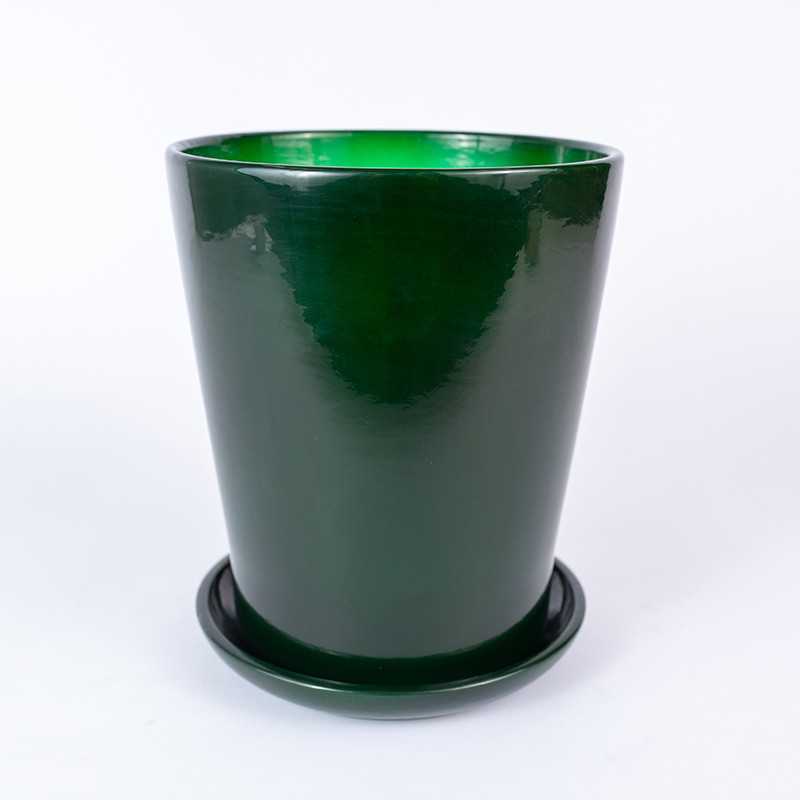 Donica ceramiczna okrągła w odcieniu zielonego połysku. Posiada otwór na spodzie oraz podstawkę w tym samym odcieniu.
