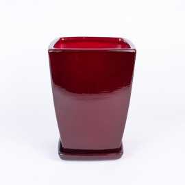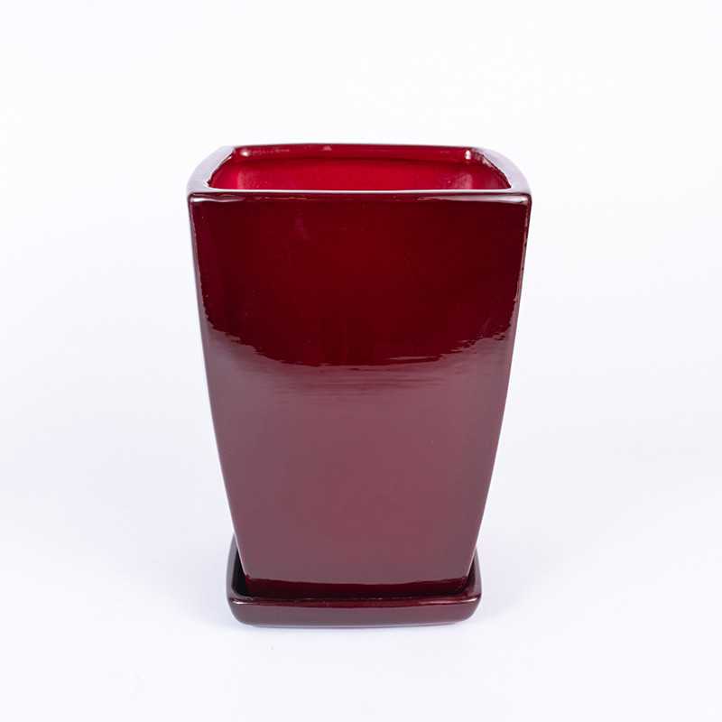 Donica ceramiczna kwadratowa w odcieniu bordowego połysku. Posiada otwór na spodzie oraz podstawkę w tym samym odcieniu.