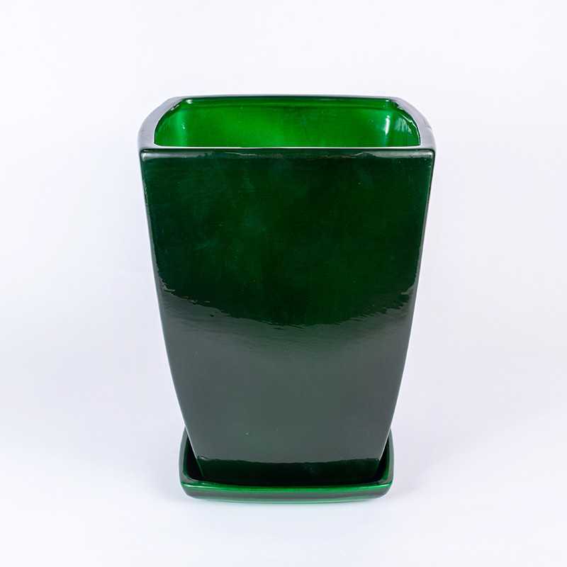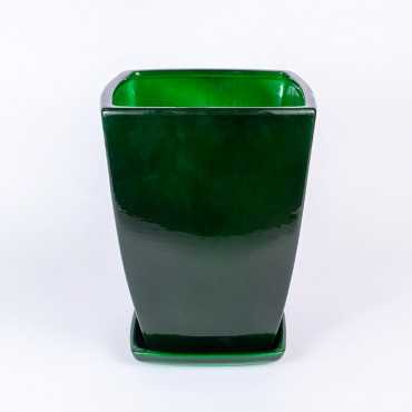 Donica ceramiczna kwadratowa w odcieniu zielonego połysku. Posiada otwór na spodzie oraz podstawkę w tym samym odcieniu.