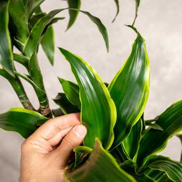 Dracena fragrans 'Dorado' to elegancka roślina doniczkowa, która wyróżnia się swoimi szerokimi, łukowato wygiętymi liśćmi o intensywnie zielonym kolorze, z subtelnymi żółtymi brzegami. Ta odmiana draceny jest nie tylko estetyczna, ale także wyjątkowo łatwa w uprawie, co czyni ją idealnym wyborem zarówno dla początkujących, jak i doświadczonych miłośników roślin.
