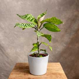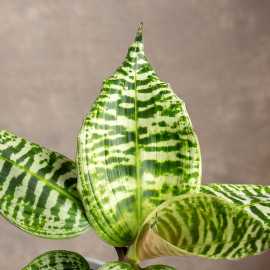 Dracaena goldieana charakteryzuje się szerokimi liśćmi o aksamitnej fakturze. Liście mają intensywnie zielony kolor z wyraźnymi, jasnymi pasami układającymi się w zygzakowaty wzór. Te niezwykle dekoracyjne liście wyrastają z krótkiej, zdrewniałej łodygi, tworząc zwartą rozetę. Roślina osiąga wysokość do około 60 cm, co czyni ją doskonałą opcją do mniejszych przestrzeni.