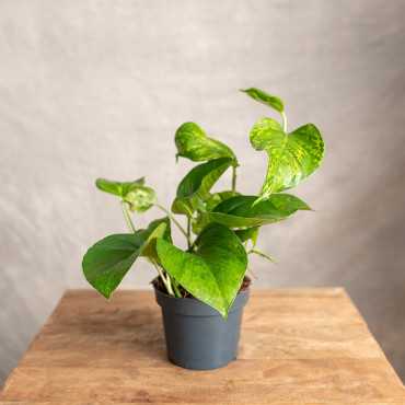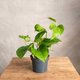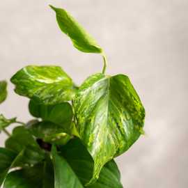 Epipremnum złociste - klasyczna odmiana o skórzastych liściach z żółtymi przebarwieniami.