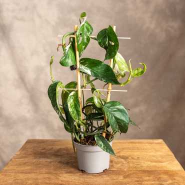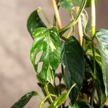 Niezwykle czarujące epipremnum o ciekawych, powcinanych i dziurkowanych liściach z przykuwającą wzrok, białą wariegacją. Pnącze to najlepiej wygląda prowadzone przy podporze.