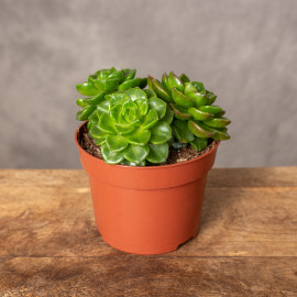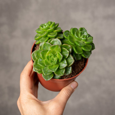 Eszeweria 'Afines' to elegancka roślina o wyjątkowo szlachetnym wyglądzie. Jej liście układają się w zwartą, symetryczną rozetę, tworząc harmonijną formę, która zachwyca prostotą i precyzją natury. Liście mają soczyście zielony kolor, a ich końcówki są w delikatnym czerwonym odcieniu i subtelnie się zaostrzają.