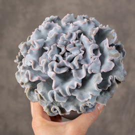 Eszeweria 'Crispy Beauty' to efektowny sukulent tworzący regularne rozety z mocno pofalowanych liści, które nadają roślinie wyjątkowo dekoracyjny charakter. Ich delikatnie pastelowe odcienie szarości i zieleni, często z różowymi lub srebrzystymi akcentami na brzegach, pięknie podkreślają rzeźbiarską formę rośliny.