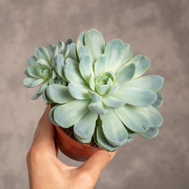 Echeveria ‘Silver Queen’ to elegancka odmiana o pięknym, srebrzysto-niebieskim ulistnieniu. Jej mięsiste, lancetowate liście układają się w regularną rozetę, tworząc efektowną, geometryczną formę. Dzięki delikatnemu, srebrnemu nalotowi wygląda bardzo subtelnie i nowocześnie, doskonale pasując do wnętrz w stylu minimalistycznym czy skandynawskim.