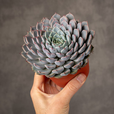 Echeveria cuspidata 'Texensis Rosea' to wyjątkowa odmiana o pięknie zbudowanej rozecie, której mięsiste liście zwężają się ku końcówkom, tworząc charakterystyczny, wyrazisty kształt. Liście mają delikatny, pudrowy nalot i subtelne różowe lub różowofioletowe wybarwienia, które intensyfikują się przy dobrym oświetleniu.