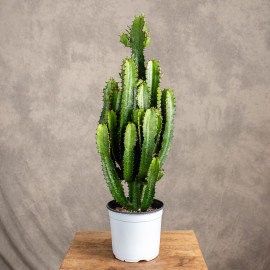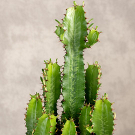 Euphorbia acrurensis to ciekawa, kolumnowa roślina pochodząca z Afryki, często nazywana "afrykańskim kaktusem" – choć technicznie nie jest kaktusem, a wilczomleczem. Tworzy wzniesione, kanciaste łodygi o wyraźnych żebrach i drobnych kolcach, które z wiekiem rozgałęziają się, tworząc efektowną, rzeźbiarską formę. Ma intensywnie zielony kolor z delikatnymi, jaśniejszymi smugami i może osiągać spore rozmiary, dlatego świetnie sprawdza się jako roślina soliterowa w nowoczesnych wnętrzach.