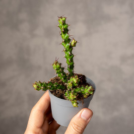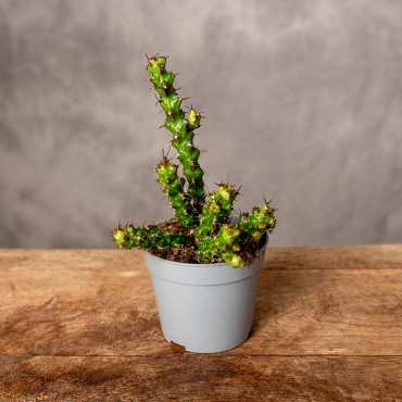 Euphorbia lenewtonii to rzadko spotykany, kolekcjonerski gatunek wilczomlecza pochodzący z Afryki Wschodniej, ceniony za swój nietypowy, rzeźbiarski pokrój i surowe piękno pustynnych form. Tworzy grube, segmentowane pędy o zielonkawo-szarym kolorze, często z delikatnym nalotem i ciemniejszymi, nieregularnymi brzegami. Jego kanciaste łodygi mogą z czasem rozrastać się w fantazyjne, kręte struktury przypominające miniaturowe drzewka pustynne.