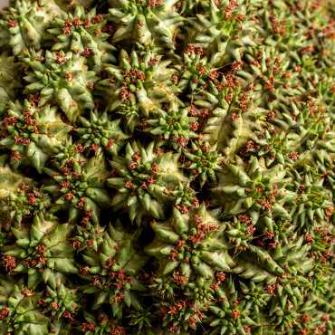 Euphorbia suzannae – kompaktowy, niezwykle dekoracyjny wilczomlecz o charakterystycznym kulistym pokroju. Jego mięsiste, jasnozielone pędy tworzą zwarte rozety, często z delikatnymi ząbkowanymi brzegami. Roślina wytwarza drobne, żółtawe kwiaty, które subtelnie podkreślają jej egzotyczny wygląd. Jest to gatunek idealnie przystosowany do warunków suchych – preferuje stanowiska słoneczne i dobrze przepuszczalne, piaszczyste podłoże. Podlewanie powinno być oszczędne, szczególnie w okresie zimowym, aby uniknąć nadmiernej wilgoci, która mogłaby zaszkodzić korzeniom.