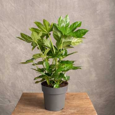 Fatsja japońska jak wskazuję nazwa pochodzi z Japonii, gdzie jako wiecznie zielony krzew osiąga wysokość do 5 m. Początkowo tworzy zdrewniałą łodygę, a potem na niej stopniowo rozwijają się pędy boczne. Liście są długoogonkowe, dłoniaste siedmio i dziewięcio - palczaste, lśniąco zielone i bardzo atrakcyjne. Niepozorne, zielonkawo - białe kwiaty, zebrane w baldachy, pojawiają się jedynie u starych egzemplarzy. Owocem jest ciemna jagoda.