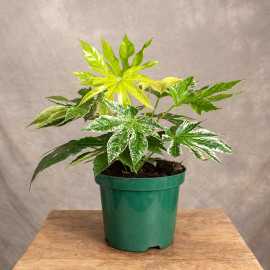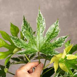 Fatsja japońska 'Variegata' to efektowna odmiana popularnej fatsji japońskiej, charakteryzująca się dużymi, dłoniastymi liśćmi o wyjątkowym, pstrokatym ubarwieniu. Liście są zielone z nieregularnymi kremowobiałymi przebarwieniami, które nadają roślinie elegancki, egzotyczny wygląd.