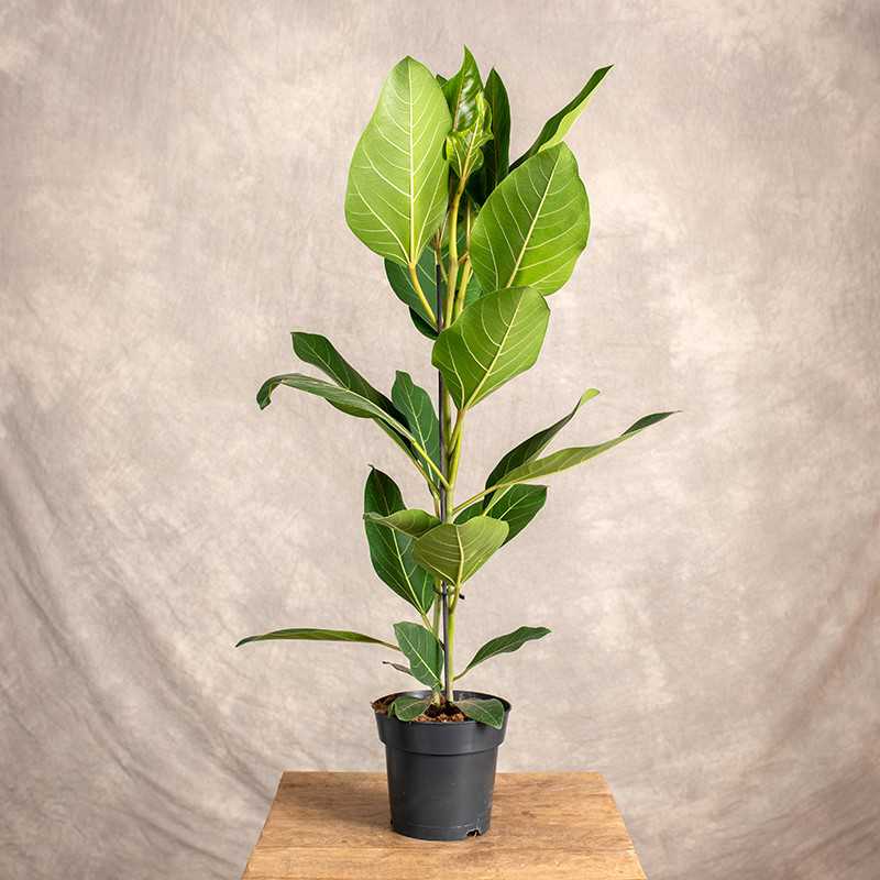 Fikus bengalski 'Joy' to piękna i elegancka roślina z dużymi, skórzastymi liśćmi w odcieniu soczystej zieleni. Blaszka liściowa dodatkowo ozdobiona jest wyraźnie zaznaczonym unerwieniem. Jak każdy fikus lubi stanowiska z dużą ilością rozproszonego światła.