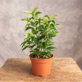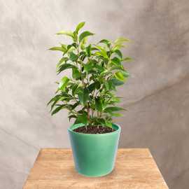 Fikus benjamina 'Natasja' to kompaktowa odmiana popularnego fikusa, która doskonale nadaje się do niewielkich przestrzeni. Jej subtelny wygląd i elegancka forma sprawiają, że jest idealnym wyborem do wnętrz i przestrzeni biurowych. Ma zwarty i kompaktowy pokrój, osiąga wysokość do 30–50 cm, co czyni go doskonałym wyborem dla osób szukających niewielkich roślin doniczkowych.
