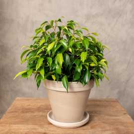 Fikus benjamina jest najlepiej znanym spośród gatunków o małych liściach. Uprawiany w pomieszczeniach może dorastać nawet do wysokości 5 m. Pochodzi z Indii, gdzie wyrasta w duże drzewa o rozłożystych koronach. Liście ma błyszczące, zielone, nieco skórzaste, gęsto osadzone na pędach. Gałązki zwieszają się zwłaszcza u większych roślin. Jest bardzo dekoracyjny, chętnie wykorzystywany przez architektów zieleni.