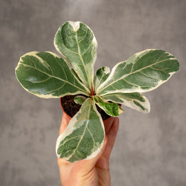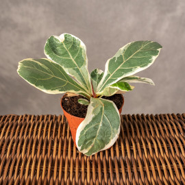 Fikus lirolistny ‘Variegata’ (Ficus lyrata ‘Variegata’) to spektakularna odmiana popularnego fikusa, która zachwyca nie tylko swoim pokrojem, ale przede wszystkim niezwykłym wybarwieniem liści. Jego duże, błyszczące liście o charakterystycznym, „lirowym” kształcie ozdobione są nieregularnymi kremowymi i jasnozielonymi przebarwieniami, dzięki czemu roślina wygląda jak żywe dzieło sztuki.