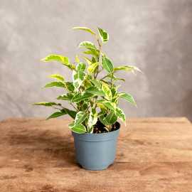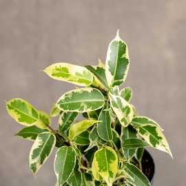 Fikus benjamina 'Petite Samantha' to urocza i kompaktowa odmiana popularnego fikusa, która wyróżnia się drobnymi, błyszczącymi liśćmi o delikatnym, jasnozielonym zabarwieniu i nieregularnymi, kremowymi marginesami. Doskonale nadaje się jako dekoracyjny element do mniejszych wnętrz, na półki czy parapety.