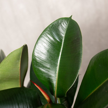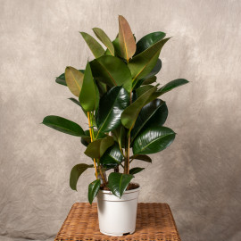 Fikus sprężysty 'Robusta' ( Ficus elastica 'Robusta') pochodzi z Indii, gdzie rośnie w formie drzewiastej i osiąga wysokość do 30 m. Liście ma szerokie, skórzaste, ciemnozielone. Nowe liście początkowo mają brązową barwę i w miarę dojrzewania zielenieją. Fikus jest łatwy w utrzymaniu, w mieszkaniach rośnie bardzo szybko i jeżeli go nie przytniemy momentalnie dosięga sufitu. Przycięty tworzy rozgałęzione drzewo, a w miarę starzenia się zrzuca dolne liście z braku odpowiedniej ilości światła. Doskonale nadaje się do biur i mieszkań. Dobrze oczyszcza powietrze.