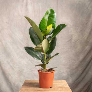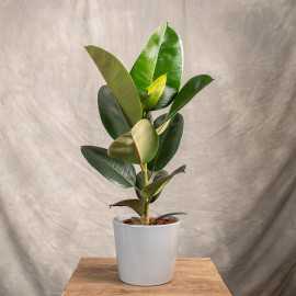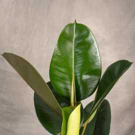 Fikus sprężysty 'Robusta' ( Ficus elastica 'Robusta') pochodzi z Indii, gdzie rośnie w formie drzewiastej i osiąga wysokość do 30 m. Liście ma szerokie, skórzaste, ciemnozielone. Nowe liście początkowo mają brązową barwę i w miarę dojrzewania zielenieją. Fikus jest łatwy w utrzymaniu, w mieszkaniach rośnie bardzo szybko i jeżeli go nie przytniemy momentalnie dosięga sufitu. Przycięty tworzy rozgałęzione drzewo, a w miarę starzenia się zrzuca dolne liście z braku odpowiedniej ilości światła. Doskonale nadaje się do biur i mieszkań. Dobrze oczyszcza powietrze.