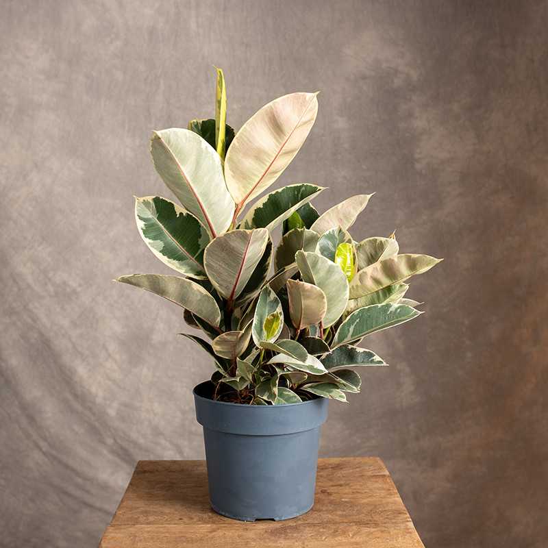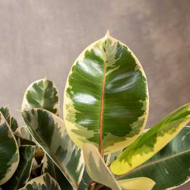 Fikus sprężysty 'Tineke' ( Ficus elastica 'Tineke' ) pochodzi z Indii, gdzie rośnie w formie drzewiastej i osiąga wysokość do 30 m. Liście ma szerokie, skórzaste, ciemnozielone. Nowe liście początkowo mają brązową barwę i w miarę dojrzewania zielenieją. Fikus jest łatwy w utrzymaniu, w mieszkaniach rośnie bardzo szybko i jeżeli go nie przytniemy momentalnie dosięga sufitu. Przycięty tworzy rozgałęzione drzewo, a w miarę starzenia się zrzuca dolne liście z braku odpowiedniej ilości światła. Doskonale nadaje się do biur i mieszkań. Dobrze oczyszcza powietrze.