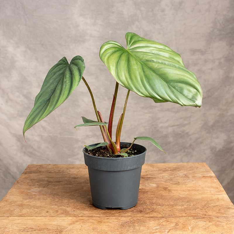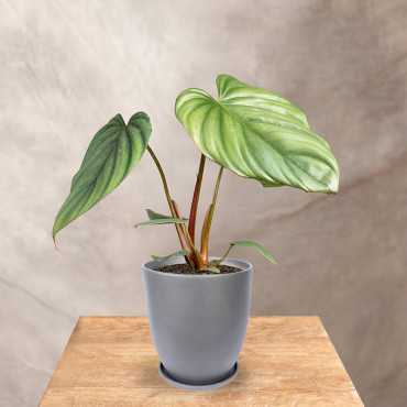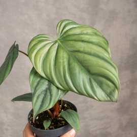 Rzadko spotykany w sprzedaży, oszałamiający filodendron. Średnica liści może przekraczać nawet 40 cm. Liście mają kształt serca i żebrowaną strukturę. Charakteryzują się welurową fakturą i subtelnym połyskiem. Młode liście są jasnozielone ze złotym blaskiem na wypukłych prążkach z wyraźnie ciemniejszymi nerwami. W miarę dojrzewania liście zmieniają barwę, stają się ciemnozielone, zyskują srebrzysty blask. Blaszki liściowe osadzone są na wyprostowanych, cylindrycznych, z czerwoną pochewką. Charakteru dodają obrzeża liści subtelnie muśnięte żurawinowym kolorem.