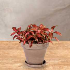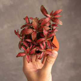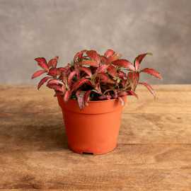 Fittonia 'Red Forest Flame' charakteryzuje się małymi, podłużnymi, lekko falowanymi liśćmi. Każdy z nich jest ozdobiony wyrazistymi, czerwonymi żyłkami, które przypominają płomienie rozchodzące się po całej powierzchni blaszki liściowej. Roślina rośnie nisko, tworząc gęste kobierce. Lubi podwyższoną wilgotność powietrza co, sprawia, że jest idealna do uprawy w szklanych kompozycjach czy terrariach.