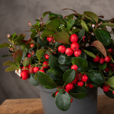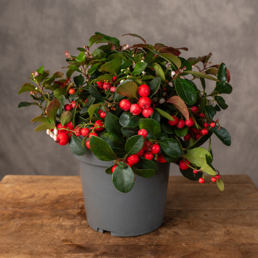Golteria rozesłana 'Big Berry' to zimozielona, niska krzewinka wyróżniająca się wyjątkowo dużymi, intensywnie czerwonymi owocami, które utrzymują się na roślinie przez całą zimę. Jej błyszczące, ciemnozielone liście jesienią nabierają bordowych odcieni, dodając dekoracyjności.