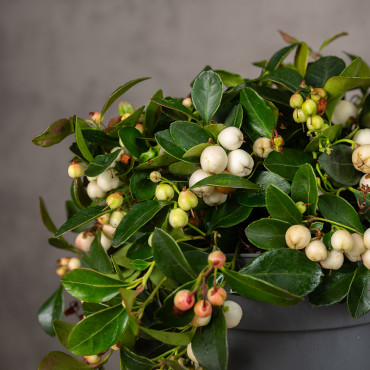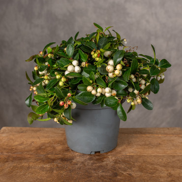 'Ciao Bella White' to zachwycająca odmiana golterii rozesłanej. To roślina zimozielona, niska i gęsta, tworząca efektowne poduchy błyszczących, ciemnozielonych liści. Jej największą ozdobą są śnieżnobiałe, kuliste owoce, które pojawiają się jesienią i utrzymują aż do wiosny. W połączeniu z żywą zielenią liści wyglądają jak naturalne perełki, rozświetlając rabaty, tarasy czy dekoracje świąteczne. Owoce są trwałe i niezwykle dekoracyjne, a roślina świetnie znosi mróz.