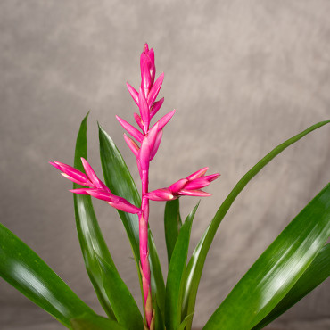Guzmania 'Claire' to tropikalna, doniczkowa roślina z rodziny bromeliowatych, charakteryzująca się długimi, zimozielonymi liśćmi i intensywnie wybarwionym, trwałym kwiatostanem. Rośnie do około 40-50 cm wysokości, wymaga jasnego stanowiska bez bezpośredniego słońca, wysokiej wilgotności powietrza oraz podlewania do rozety liściowej.