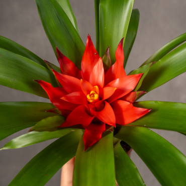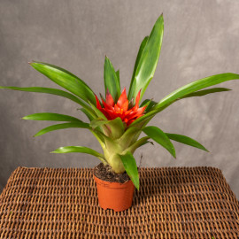 Guzmania 'Glow' to egzotyczna roślina doniczkowa, która zachwyca intensywnym pomarańczowym kwiatostanem. Jej długie, wąskie liście są ozdobione czerwonymi łuskami, które dodają uroku. Kwitnie przez wiele miesięcy, a po przekwitnięciu wyrasta z boku rozetki nowa, ozdobna odmiana. Guzmania 'Glow' doskonale sprawdza się jako ozdoba biur i mieszkań, a także jako nietypowy prezent.