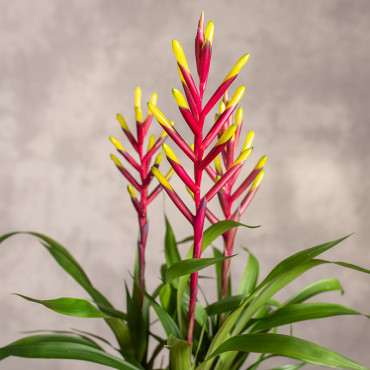 Guzmania 'Misty' to niezwykle dekoracyjna roślina z rodziny bromeliowatych, która zachwyca egzotycznym wyglądem. Jej wąskie, sztywne liście tworzą rozłożystą rozetę w intensywnej zieleni, z której wyrasta okazały kwiatostan. Serce rośliny rozświetla jaskrawy, różowo-żółty pióropusz.