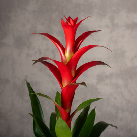 Guzmania ‘Rostara’ to tropikalna piękność z rodziny bromeliowatych, która zachwyca egzotycznym wyglądem. Tworzy elegancką rozetę długich, smukłych liści w intensywnej zieleni, z której wyrasta efektowny, czerwony kwiatostan. Sama roślina kwitnie długo i nie wymaga skomplikowanej pielęgnacji.