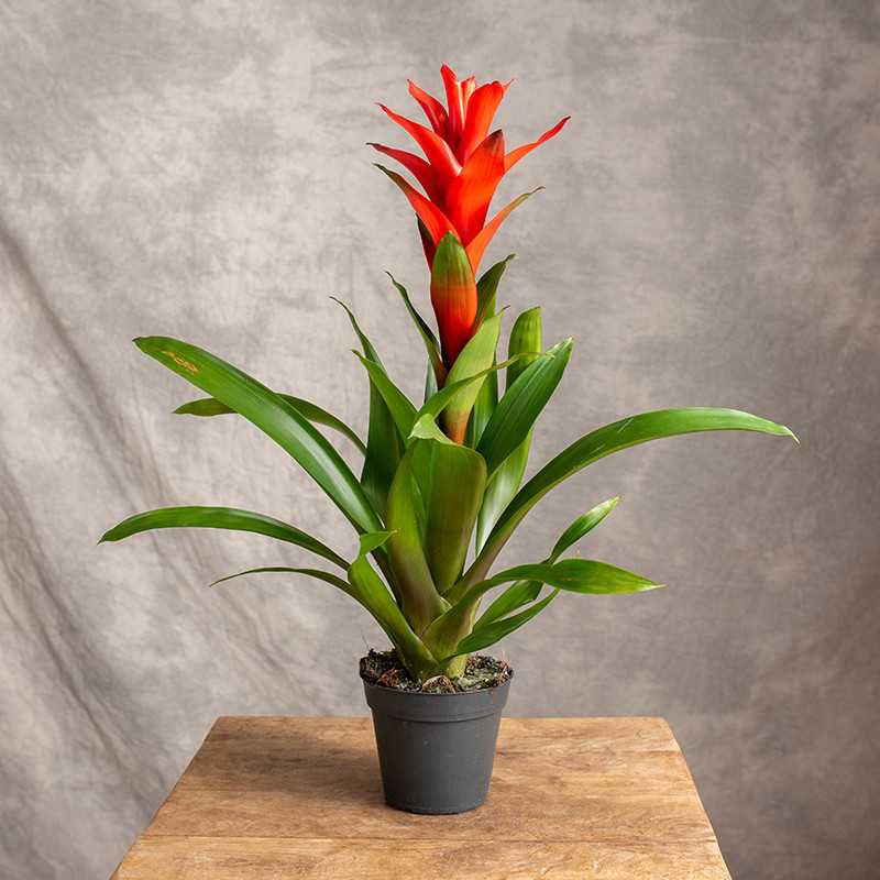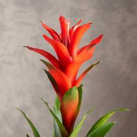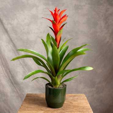 Guzmania 'Suerte Orange' to tropikalna roślina o oszałamiająco intensywnym, pomarańczowym kwiatostanie, który wyrasta z eleganckiej rozety długich, zielonych liści. Jej egzotyczny wygląd przyciąga wzrok i wprowadza do wnętrz żywe kolory, nadając im niezwykły, tropikalny klimat. Jest to idealna roślina do nowoczesnych aranżacji, biur oraz mieszkań, gdzie wniesie nieco natury i świeżości.