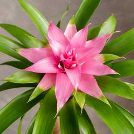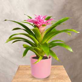 Guzmania 'Victory' to egzotyczna roślina z rodziny bromeliowatych, która przyciąga wzrok swoim tropikalnym wyglądem. Jej wyjątkowo dekoracyjny kwiatostan w kolorze pudrowego różu, utrzymujący się przez długi czas, stanowi piękny akcent w każdym wnętrzu.