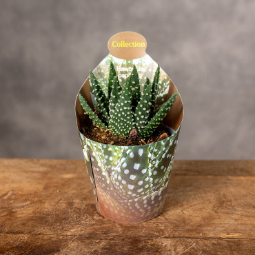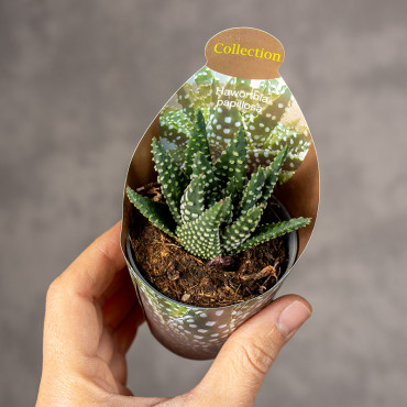 Haworthia papillosa to wyjątkowy, kompaktowy sukulent o intrygującej fakturze. Tworzy gęste rozety ciemnozielonych, mięsistych, lekko wydłużonych liści, które pokryte są licznymi, drobnymi brodawkami (papillami). To właśnie dzięki nim roślina zyskuje swoją charakterystyczną, „chropowatą”, niemal delikatnie nakrapianą powierzchnię.