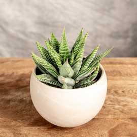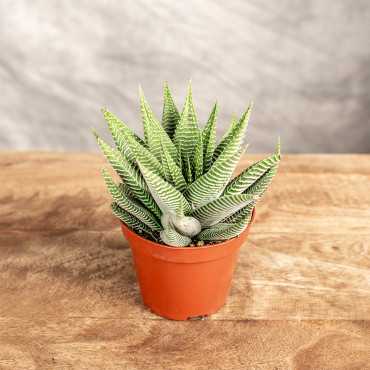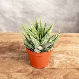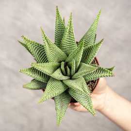 Haworsja 'Spider White' to oryginalny sukulent z mięsistymi, szarozielonymi liśćmi ułożonymi w rozetce, ozdobionymi białymi paseczkami przypominającymi wzór pajęczyny. To niewielka roślina, która wolno rośnie, jest łatwa w uprawie oraz lubi ciepłe i słoneczne stanowiska.