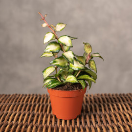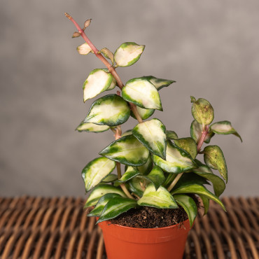 Hoja luconasa 'Bruno Tricolor' to wyjątkowa, kolekcjonerska hoja wyróżniająca się trójkolorowymi liśćmi w odcieniach zieleni, kremu i delikatnego różu. Młode przyrosty często mają różowe lub morelowe tony, co nadaje roślinie niezwykle dekoracyjny i dynamiczny wygląd.