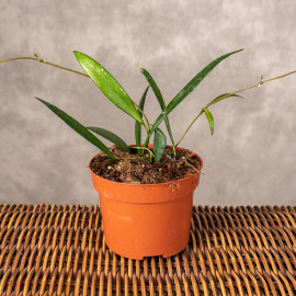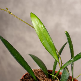 Hoya 'Minibelle' to urocza, kompaktowa odmiana. Roślina wyróżnia się smukłymi, lancetowatymi liśćmi o ciemnozielonej barwie i gładkiej powierzchni. Dzięki niewielkim rozmiarom i stosunkowo łatwej uprawie, Hoya 'Minibelle' doskonale nadaje się do wnętrz, wprowadzając subtelny, tropikalny klimat.