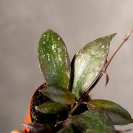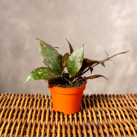 Hoya 'Nabawanensis Splash' to rzadka, kolekcjonerska odmiana hoi pochodząca z Malezji, ceniona za wąskie, mięsiste liście gęsto pokryte srebrzystymi plamkami. Ta łatwa w uprawie, zwarta roślina charakteryzuje się szybkim wzrostem i wytwarza pachnące, biało-różowe kwiaty z żółtym środkiem. Idealna do jasnych, rozproszonych stanowisk. Warto zauważyć, że hoja 'Nabawensis Splash' jest rośliną o wzroście sympodialnym, co oznacza, że nowe pędy wyrastają z bazy starszych, zdrewniałych części pędu.
