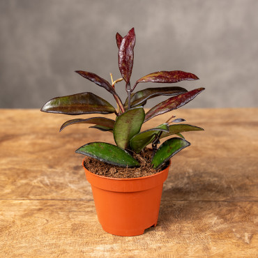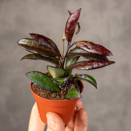 Hoya 'Red Maroon' to wyjątkowa odmiana o głębokozielonych, mięsistych liściach, które przy odpowiednim świetle nabierają bordowych, intensywnie ciemnych tonów. Jej atrakcyjność podkreślają efektowne kwiaty - kremowe lub różowawe, z ciemnoczerwonym środkiem, zebrane w charakterystyczne, pachnące baldachy.