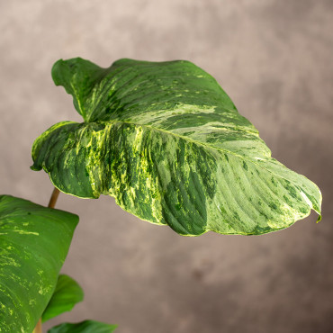 Homalomena ‘White Marble Variegata’ to zachwycająca, rzadko spotykana odmiana o eleganckim, marmurkowym wybarwieniu liści. Jej duże, sercowate blaszki łączą w sobie odcienie głębokiej zieleni, kremu i czystej bieli, tworząc subtelny, artystyczny wzór przypominający strukturę marmuru. Każdy liść jest niepowtarzalny, a delikatne kontrasty barw sprawiają, że roślina wygląda niezwykle luksusowo.