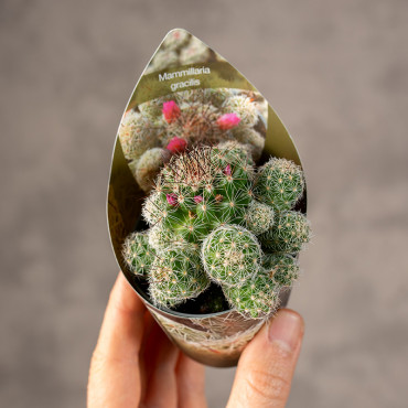 Mammillaria gracilis to uroczy, niewielki kaktus tworzący gęste kępy złożone z małych, cylindrycznych pędów pokrytych białymi, miękkimi cierniami. Dzięki temu wygląda niemal jak delikatna, puszysta poduszka i doskonale sprawdza się w małych doniczkach oraz roślinnych aranżacjach.