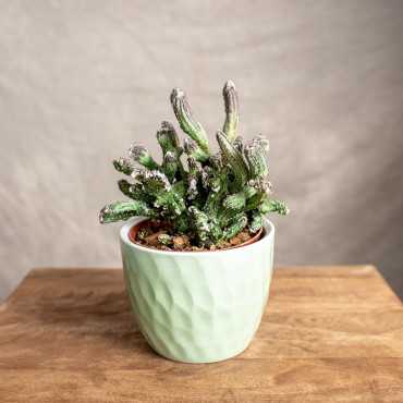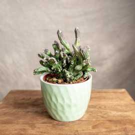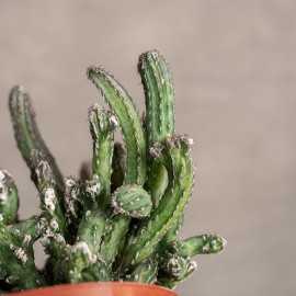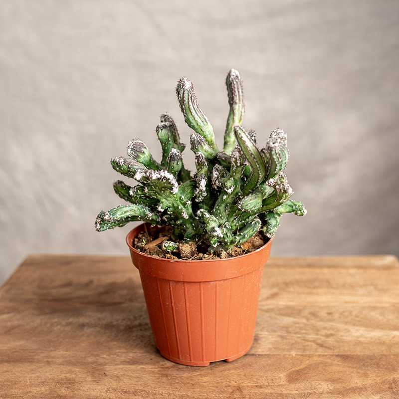 Niezwykły kaktus, który przyciąga uwagę swoją ciekawą formą. Przybiera różne asymetryczne i faliste kształty. Jego pędy mają szaro-zielony kolor z brunatnymi końcówkami i delikatnymi, białymi włoskami.
