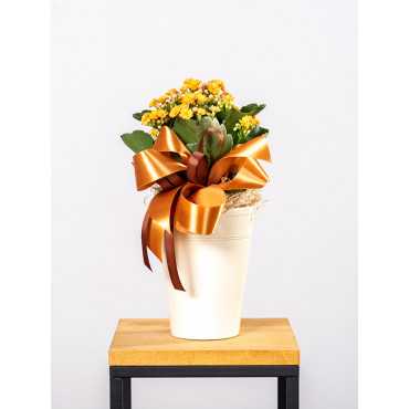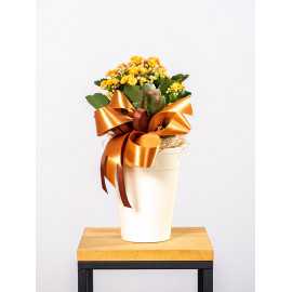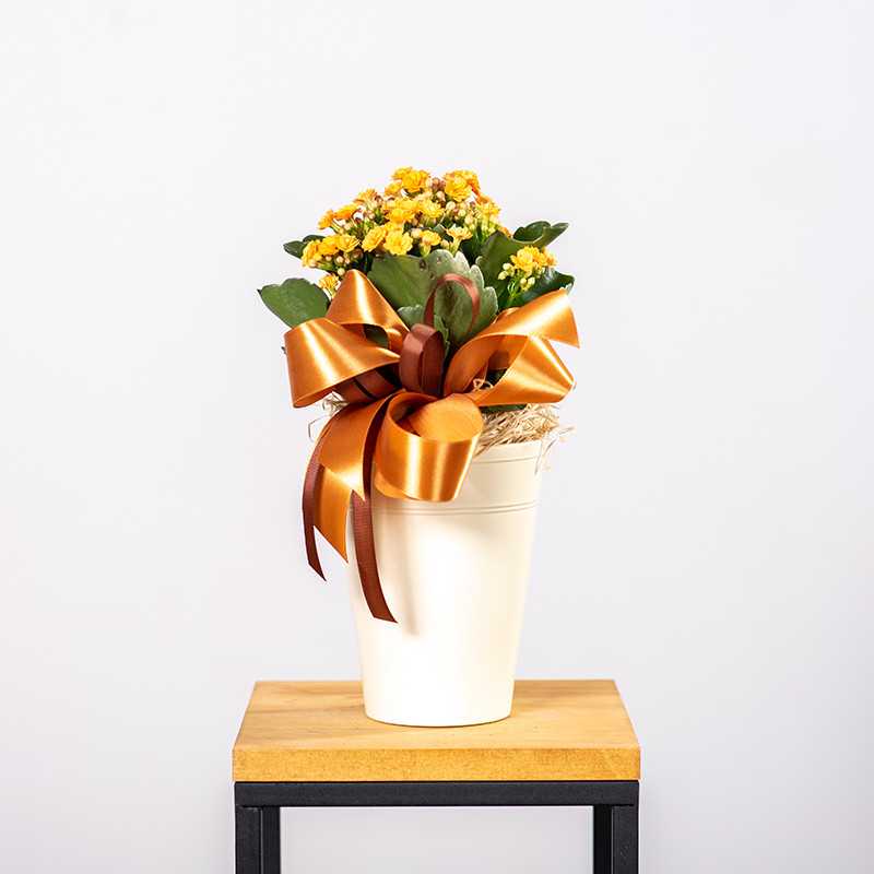 Kalanchoe mix kolorów udekorowane przez florystę. Cena zawiera zestaw: roślina + doniczka + przybranie. Zdjęcie jest poglądowe, do kompozycji może zostać dobrane kalanchoe o innym kolorze kwiatów oraz pasująca do niego doniczka.