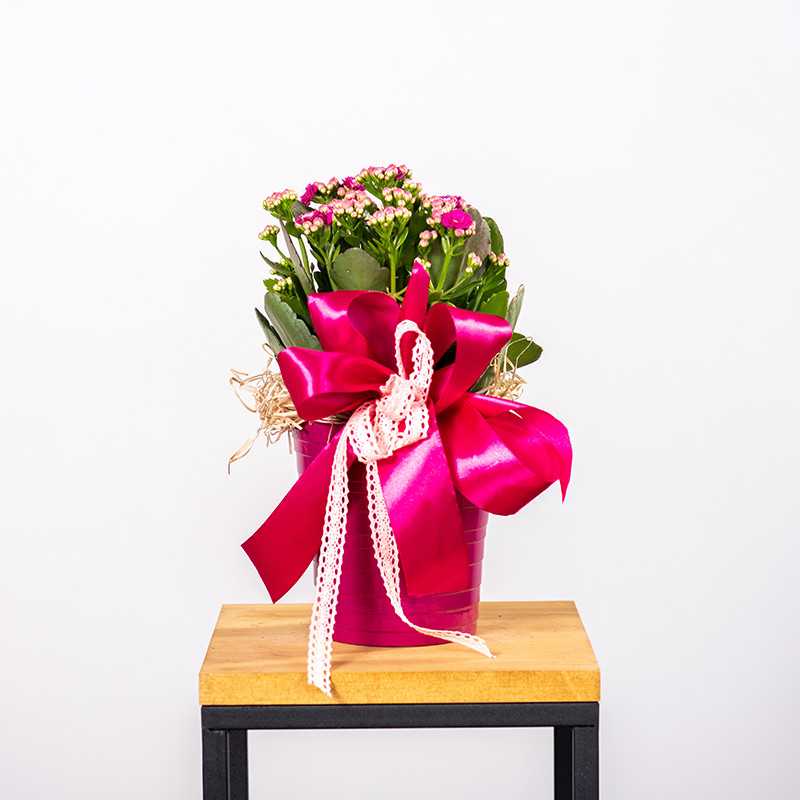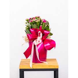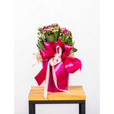 Kalanchoe w kolorze różowym udekorowane przez florystę. Cena zawiera zestaw: roślina + doniczka + przybranie.