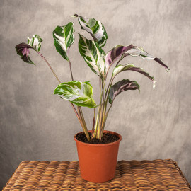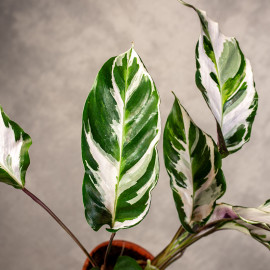 Kalatea 'Fusion White' to kultywar o pstrych liściach w odcieniach bieli, zieleni i liliowego spód liścia natomiast jest w kolorze fioletowym.
