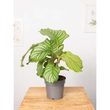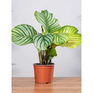 Kalatea okrągłolistna to roślina z dużymi owlanymi liśćmi w kolorze jasnej zieleni. Na każdym z nich widnieją jasne paseczki odbiegające od środka blaszki liściowej.