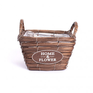 Kwadratowy kosz wyplatany w odcieniu ciemnego brązu. W środku posiada folie zabezpieczającą przez zabrudzeniem czy zalaniem.